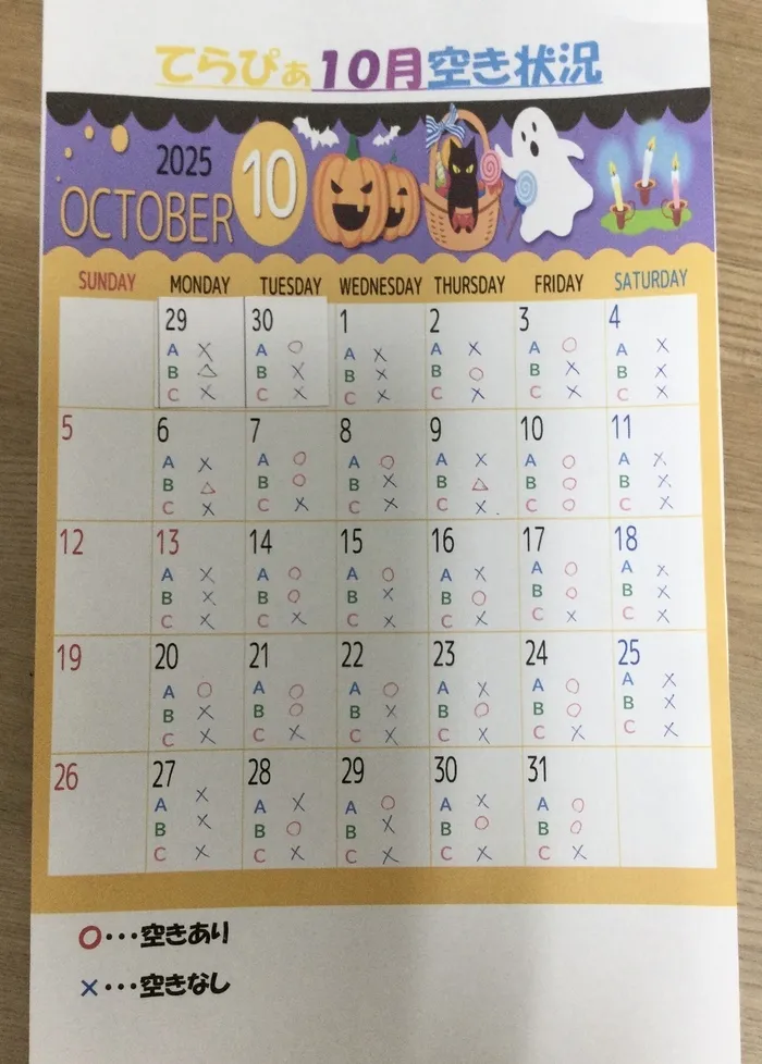添付の表は空き状況となっておりますので、空いているところでの予約をご希望の保護者様は、職員までお声かけいただくか、LINEまたはお電話でお問い合わせください。