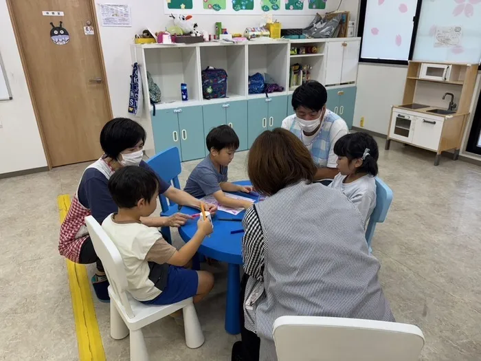 児童発達支援の小さいお友達は、パズルをしたりお絵描きしたり、ぬりえをしたり少しでも長く、みんなと一緒に座っていられるように、集中できるようにうながしていきます。