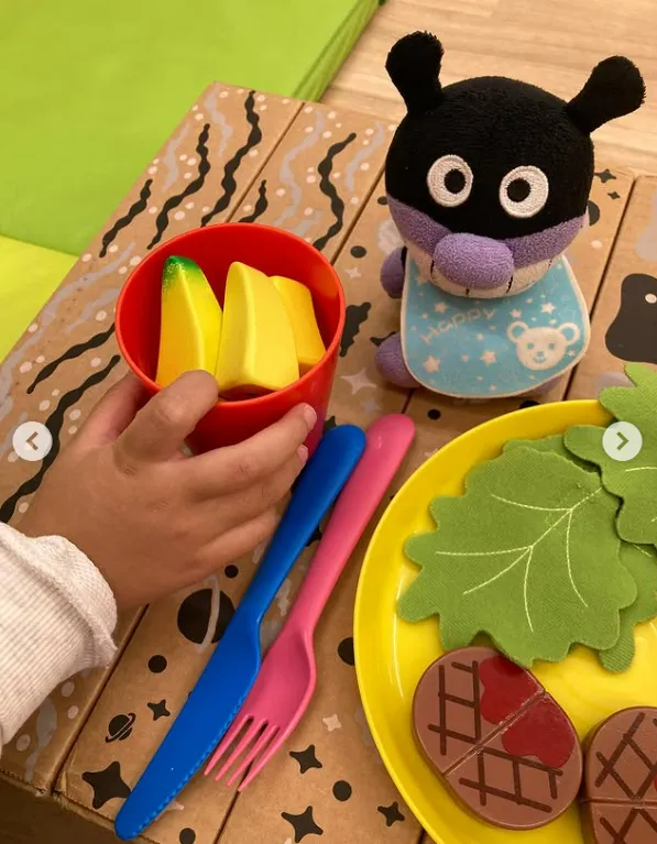 先日、キッチンで遊んでいたお子様に、アンパンマンとばいきんまんのぬいぐるみを持って「こんにちは😃」と声をかけてみると…おいしそうなお料理を振る舞ってくれました❣️✨