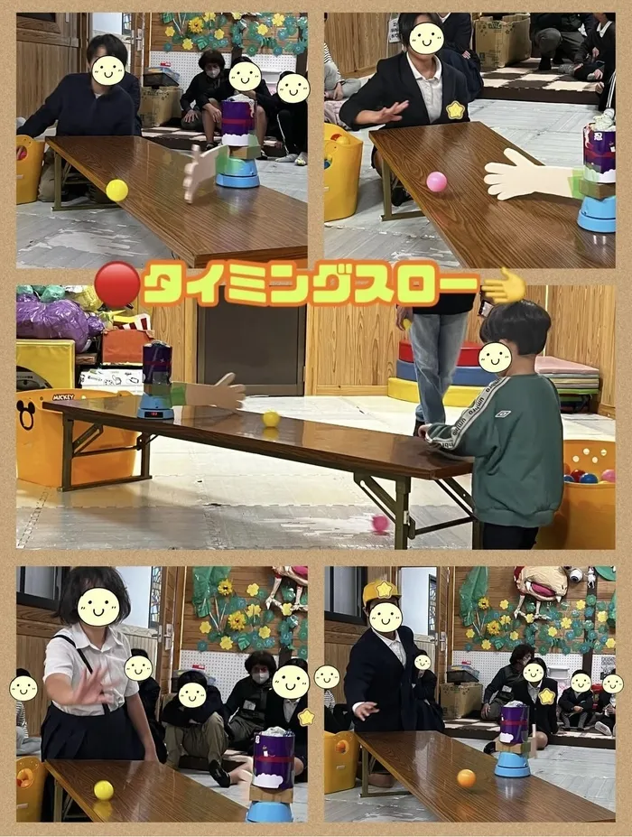 回転している手に弾かれないようにタイミングを見てボールを転がして、かごに入れていきました!