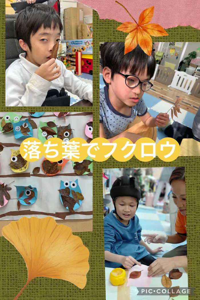 フクロウのからだに落ち葉をペッタンして完成🍂