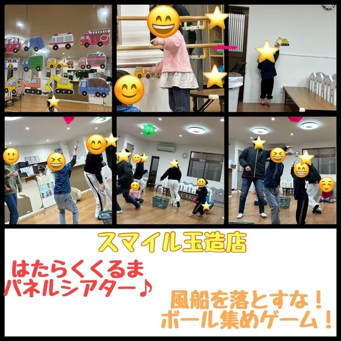 はたらくくるまのパネルシアターとチームで協力して風船を落とさずにボールを集めるゲームです🙌