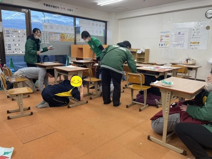クリスマス工作中に緊急地震速報が鳴り指導員の声かけで頭を隠して机の下に潜ります。