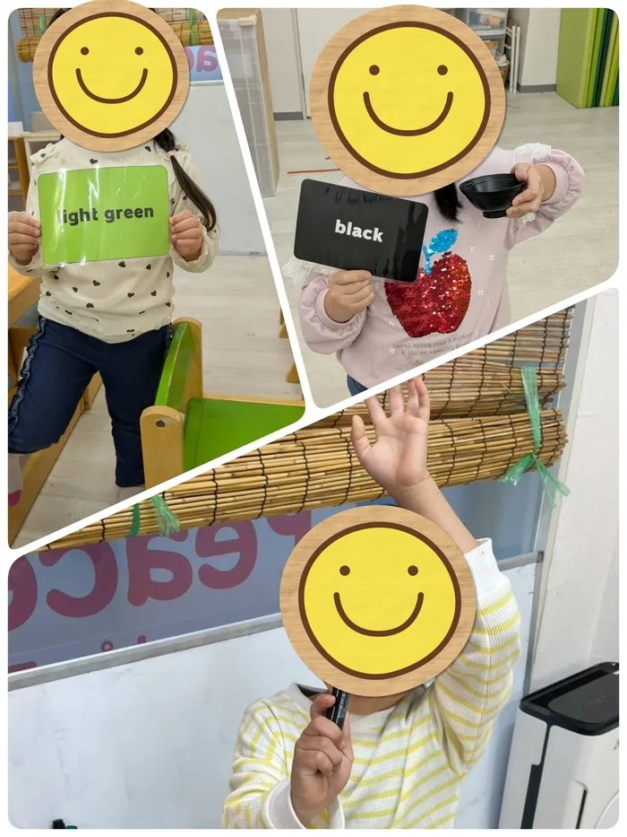 まずはフラッシュカードを使って「yellow、blue、pink・・・」と練習をしました。