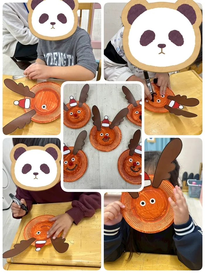 紙皿にトナカイのパーツをぺたぺたと貼り、可愛くお口をかきました🥰