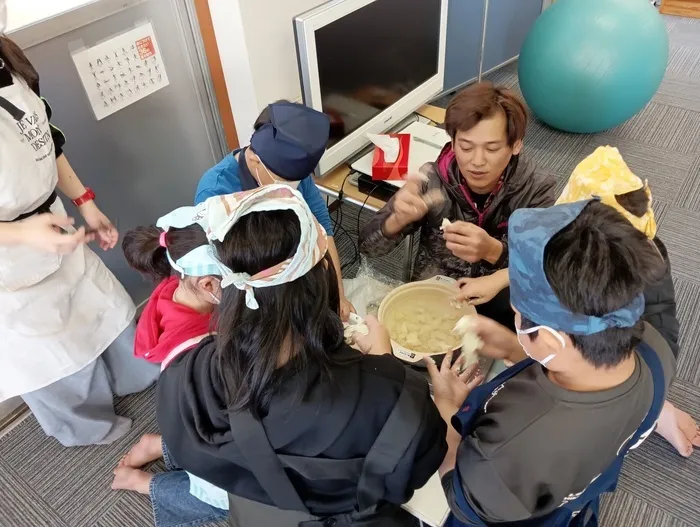 ごぼう係、ねぎ係やしいたけ係等に分かれて一仕事!最後の仕上げは皆ではっとを準備しました😁