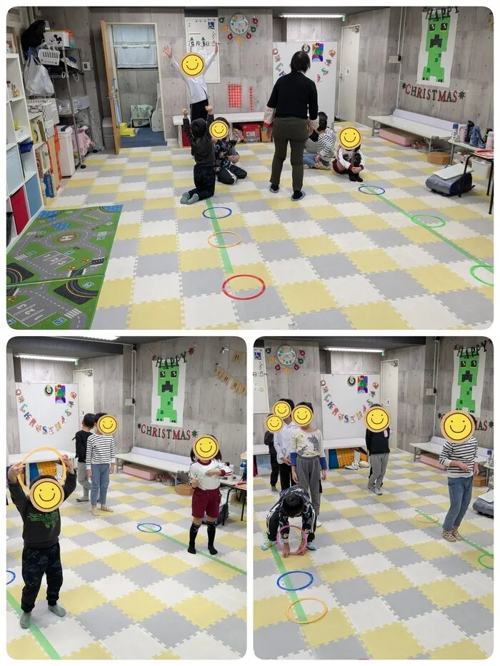 リレー方式で輪っかを頭からくぐったり足からくぐったりします。