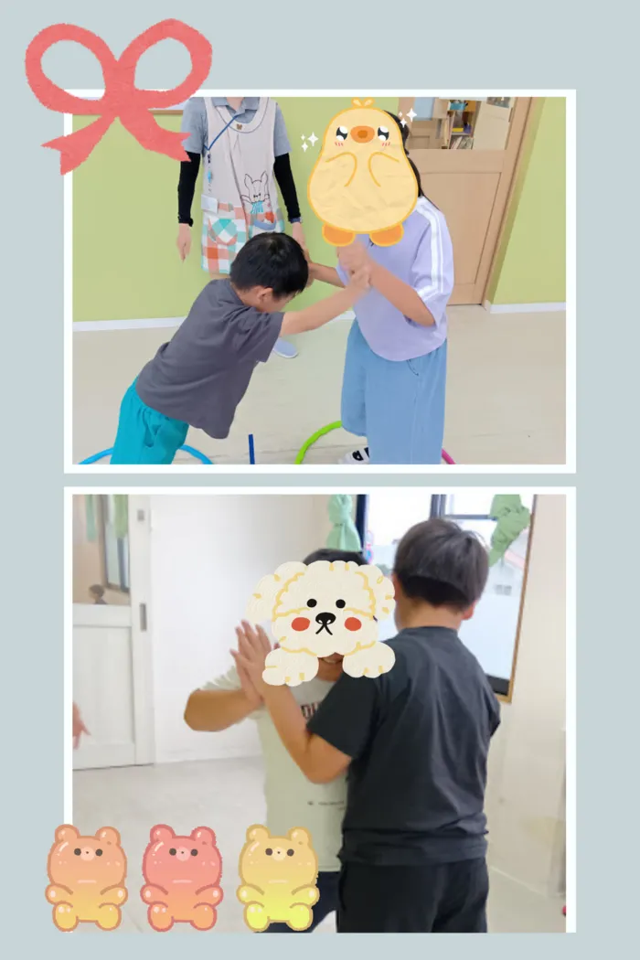 最初に、職員と手で押し合う練習をしてから、お友だちと対戦しました!(^^)!