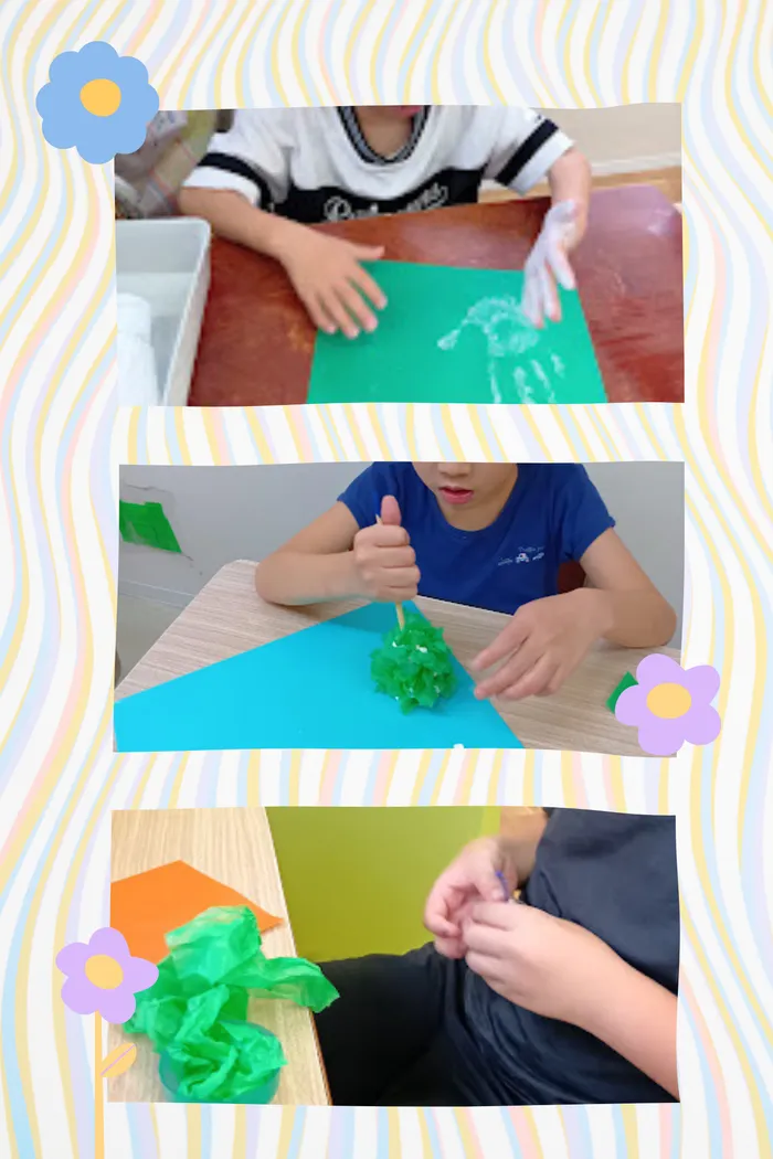 例えば、手形アートでは、フィンガーペイントでの絵の具の匂いや、冷たさ、柔らかさ、色の変化など、五感を使ってたくさんのことを楽しみながら、手の巧緻性をはぐくむことができます。