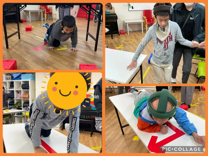 矢印がどこを指してるのかよく見ながら、ハードルを越えたり、机の上、横、下を通ったりしました!