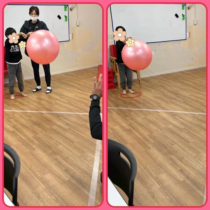 大きなバランスボールを使い、キャッチして相手に投げ返しました🏐!