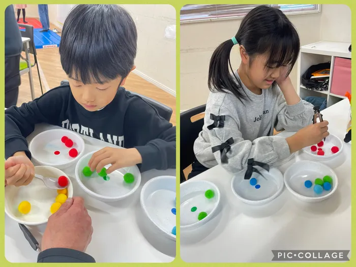 手先を使う練習では、トングやスプーンを使って各お皿に色ごとに物を分けていきました!🥄