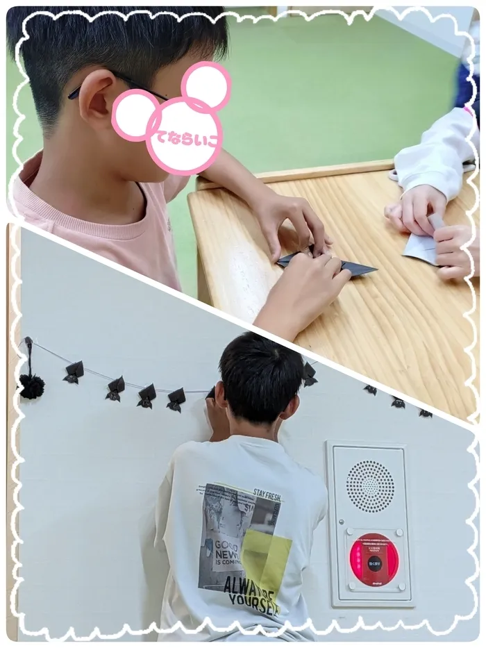 もうじきハロウィンなので、てならいこのかべを飾りつけをしました。