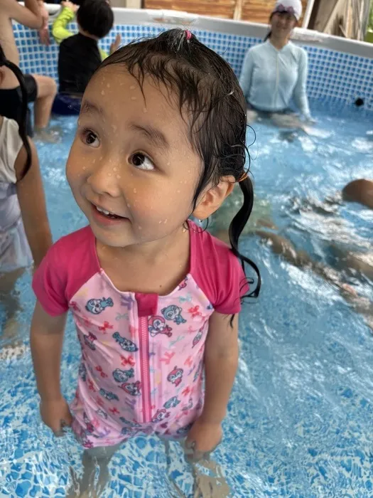 本日はお昼から裏庭に出て今年最後のプールをしました!曇り空で天候には恵まれなかったですが、準備体操をしてから思う存分に遊びました😊