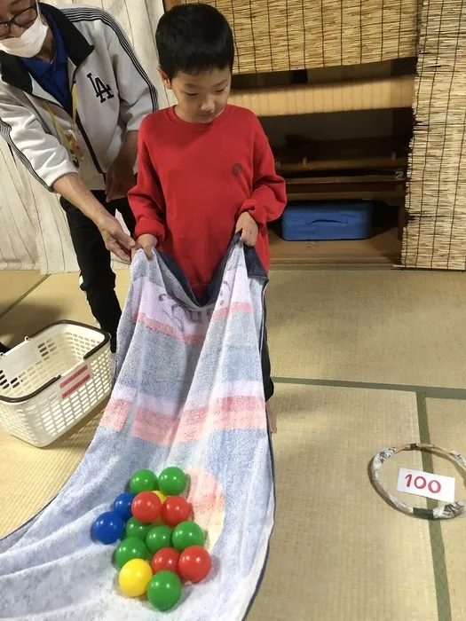 今日の全体レクは、2人で協力して大きなタオルにのせたカラーボールを放り投げるゲームでした〜🌸😁