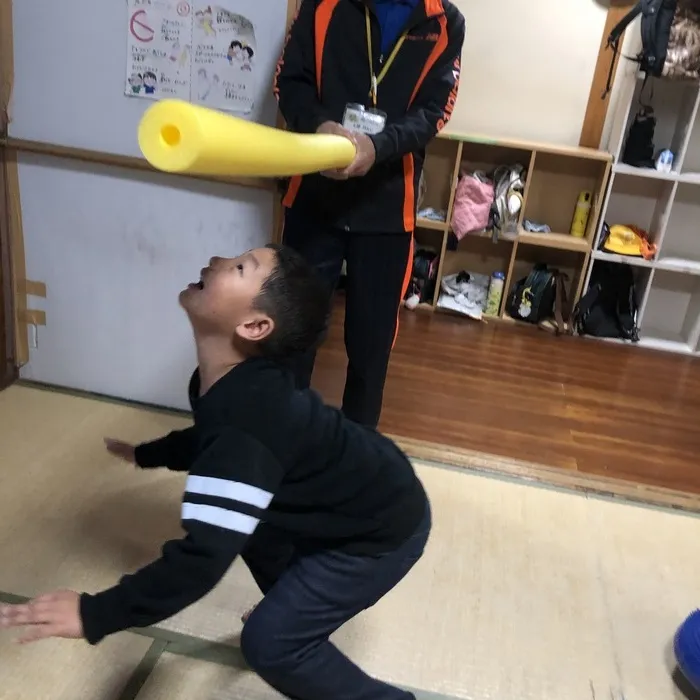 ジョイントマットや机、プールスティックなど、楽音寺にあるものを色々組み合わせて、しっかり体を動かしました💪