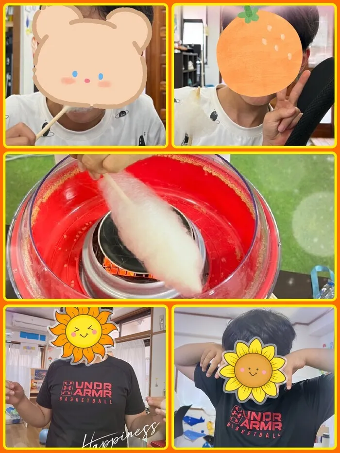 ザラメを機械の中に入れて、もくもくと出てくるわたあめをくるくる回して、完成したわたあめをみんなにプレゼントしました(*^-^*)