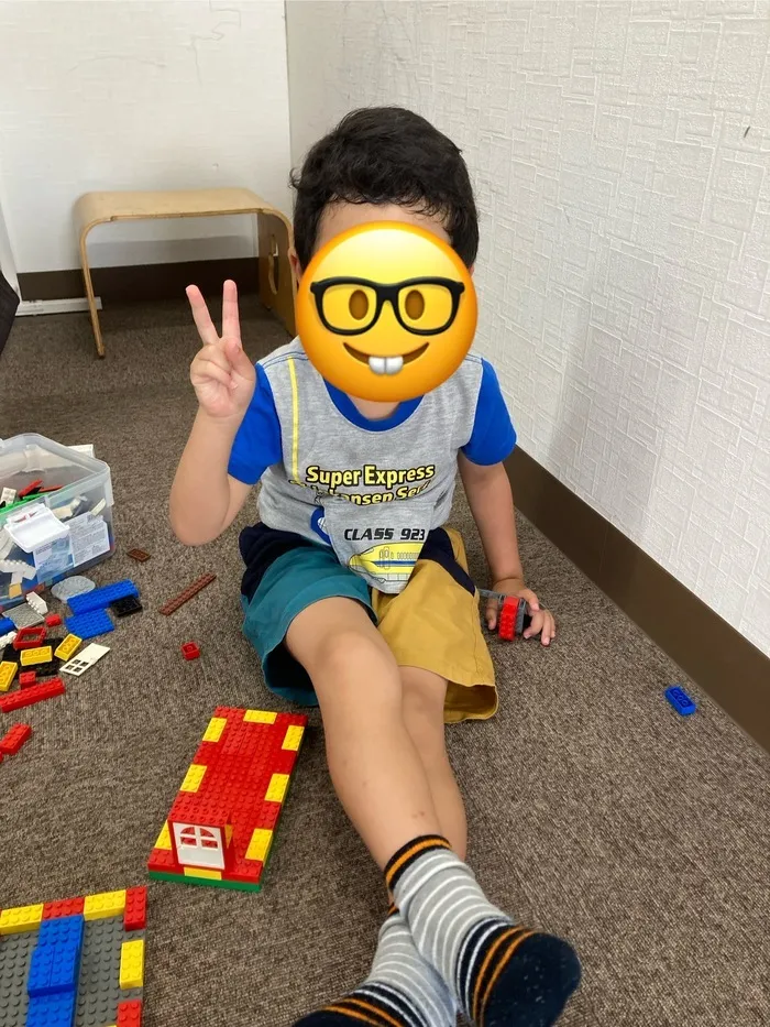 M君は、赤と黄色のブロックの色をきれいに仕分けて家を制作したりするなど、手先を上手に使い楽しく活動しております。
