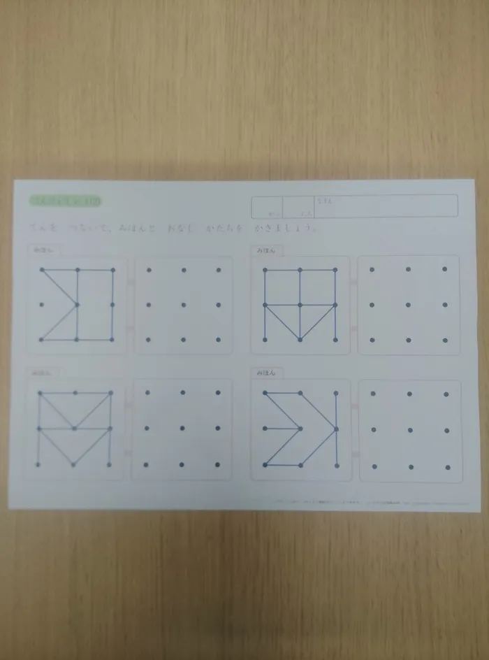 「点描写」は、点と点をつないで見本と同じ図形を書き写すという、一見単純な作業に見えますが、特に書く力の向上に役立ちます。