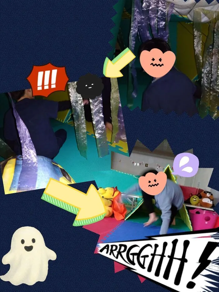 仲良くお化け役、探検をする役に分かれて、マットめいろをして遊んでいました。