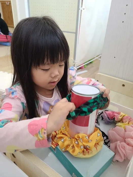 最初はシュシュをうまく棒に通せなかったHちゃんも、何度かチャレンジするうちにコツをつかんで、自分でスッと棒に通せるようになっていました👏✨