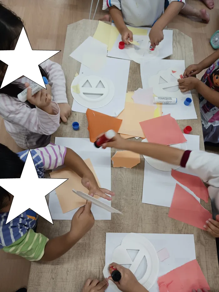 ちぎった紙を1枚ずつ紙皿に貼っていきます👐