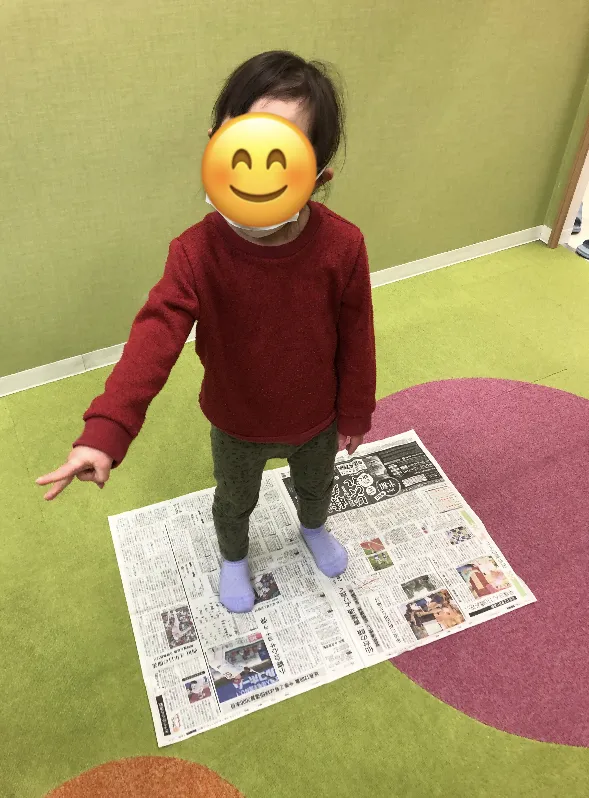 先日は『新聞紙じゃんけん』に取り組みました!じゃんけんをして負けた人が新聞紙を半分に折り、足が新聞紙から落ちたら負けというゲームです😚