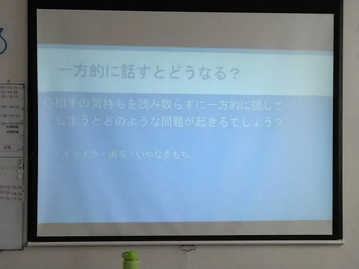 一方的な話し方や関わり方の良くない点やなってしまう要因などを他児童と確認しています。
