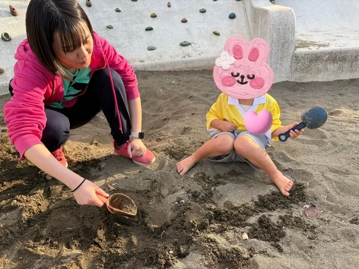 砂場遊びでは、型を使って形を作ったり穴を掘ったり…夢中で砂を触っています。