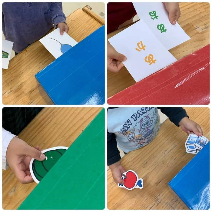 赤、青、黄、緑のポストに同じ色の絵カードを入れていきます♪「トマトは赤色だから赤色ポスト!」「これは緑の…なんだろう🤔」と自信満々だったり、色はわかっても単語がわからなかったりと多種多様な反応でした😊