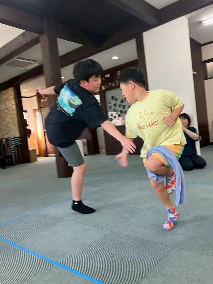 途中で両足をついてしまったり、相手を押してしまうと失格というルールの中、子どもたちは真剣勝負!バランス感覚と瞬発力をフルに使って、コート内を駆け回りました!