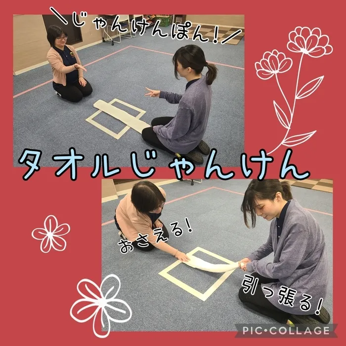 じゃんけんにの勝敗によって、タオルを引っ張ったり、おさえたりするゲームです!!