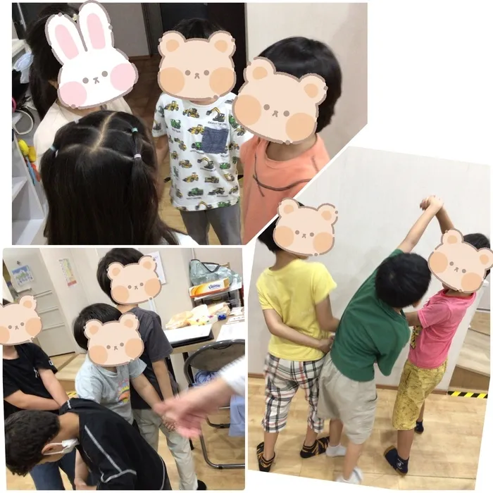 お友達の頭の上に手を通したり、お友達の手を跨いだりします。