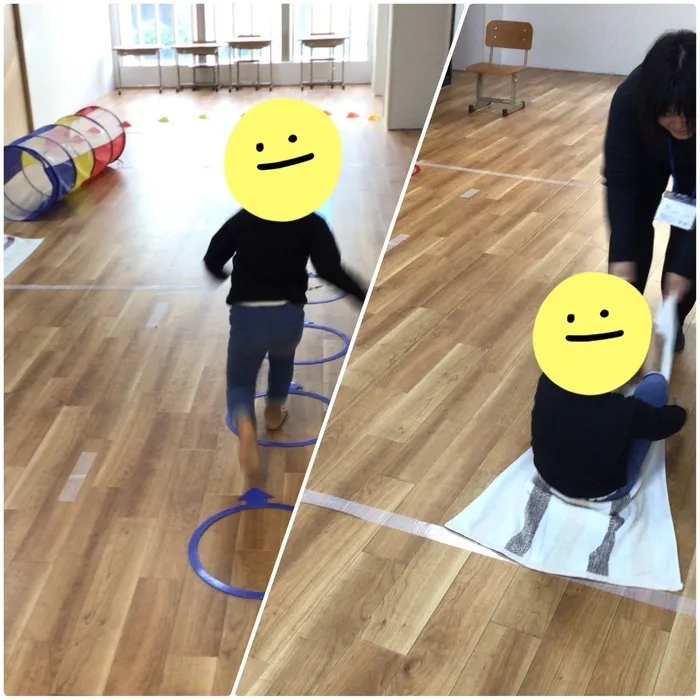 トンネルくぐりをしたり、フラフープめがけてジャンプしたりして、体をたくさん使って遊ぶことができました。