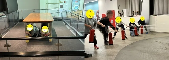 地震体験では地震が発生すると素早く机の下に隠れるなど、みんな施設のスタッフさんの指示に従ってしっかりと動くことができていました。
