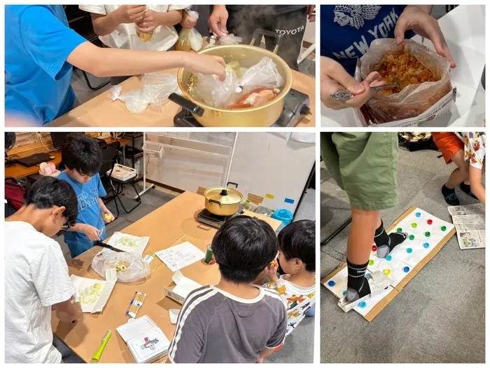 湯煎で加熱する方法、牛乳パックのまな板、チラシで折った紙皿、極力水を使わない工夫も学びました。