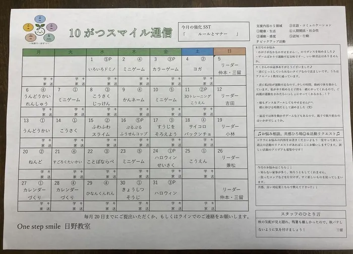 ワンステップスマイル日野教室の10月の予定となっております🌰