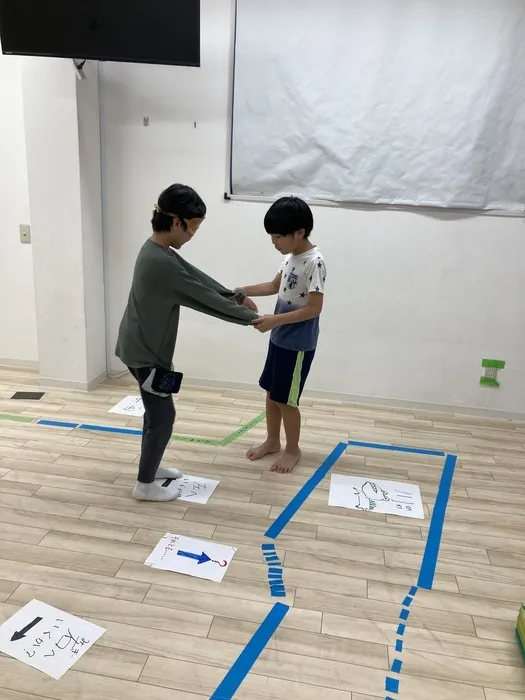 アイマスクをして周りが見えない設定のお友達と、手を持ったり身体を支えて案内をしてくれるお友達の二役に分けて行いました。