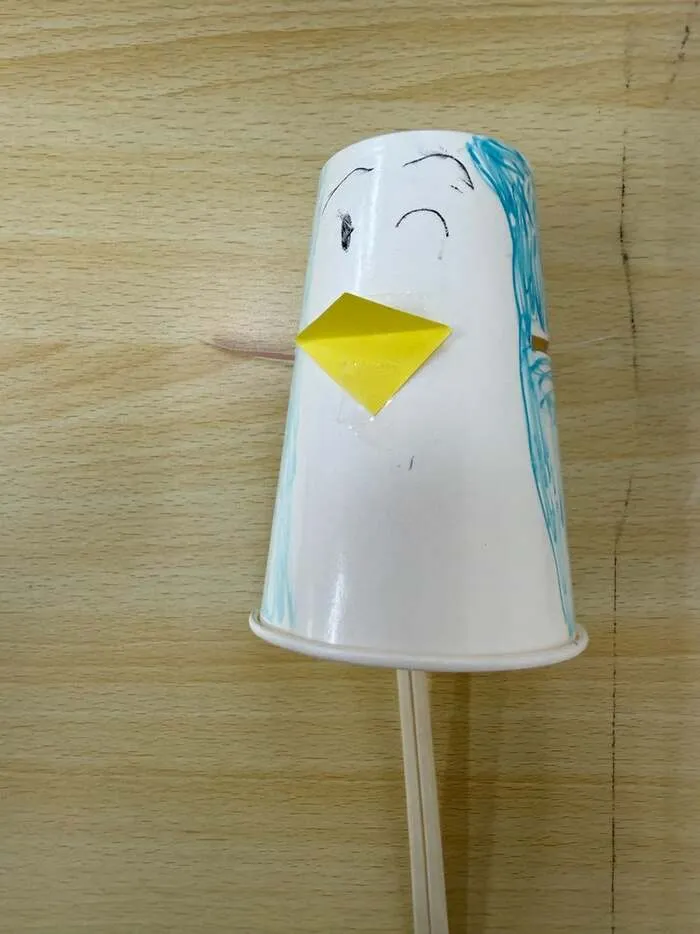 紙コップ、割り箸、画用紙を使用して手が動くペンギンを作成しました😊