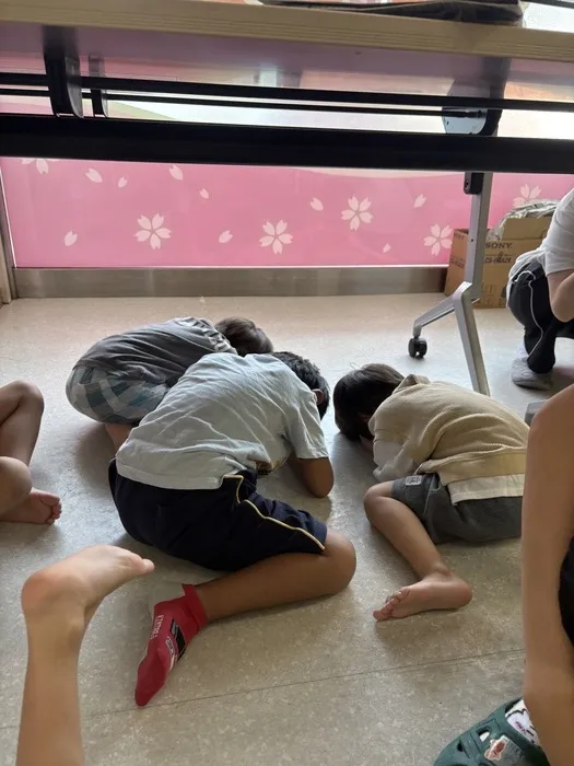 「頭を守るんだよ」と伝えると、子どもたちは一生懸命に体を小さくして身を守る姿勢をとることができました。