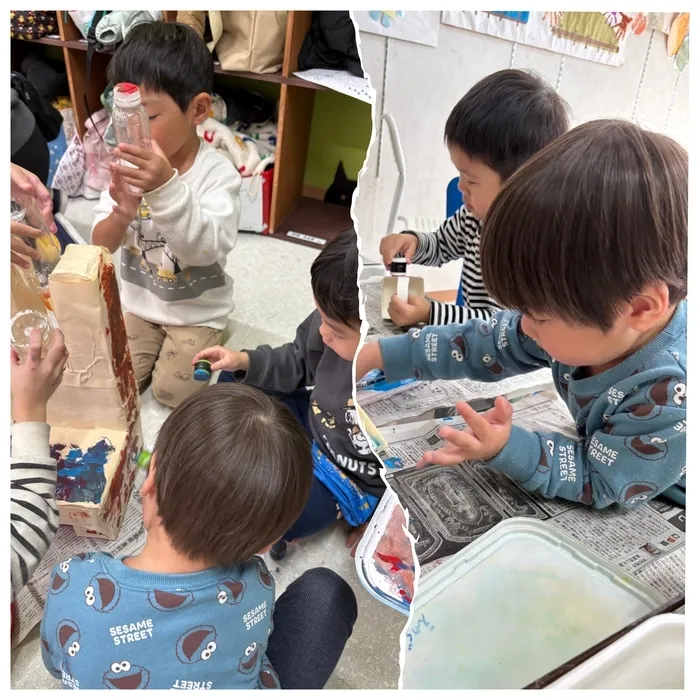 カゴ作りでは、スタンプに加え、クレヨンでカラフルに模様をつけて自分だけのカゴが完成しました。