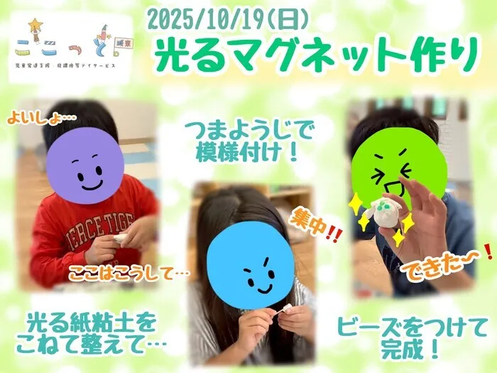 10月19日(日)のイベントでは、蓄光の紙粘土を使って光るオリジナルマグネットを作りました💡