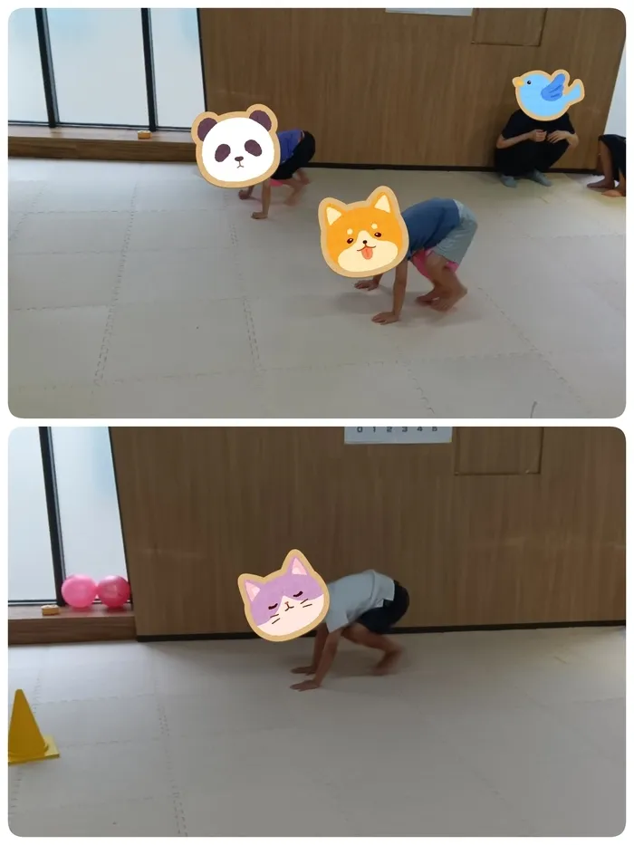 次に膝にボールを挟んだまま、うさぎ跳びに