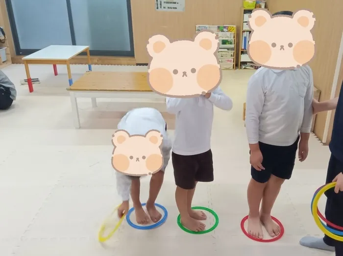 昨日はチームになって、フープを前に移動させ道を作ってゴールを目指す遊びをしました✨