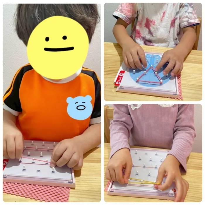 また、文字を書くことが苦手な子やまっすぐ線を引くことが苦手な子などが取り組むことで文字の形を理解して書けるようになったり、線が引けなくても輪ゴムで図形を作ることができ、視空間と図形の理解ができるようになることもあります⭐