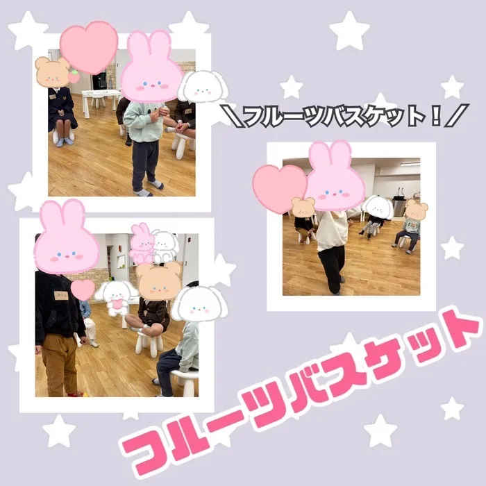 フルーツバスケットは、みかん、りんご、ぶどうなどのフルーツの名前をそれぞれ身につけてゲームを行いました!