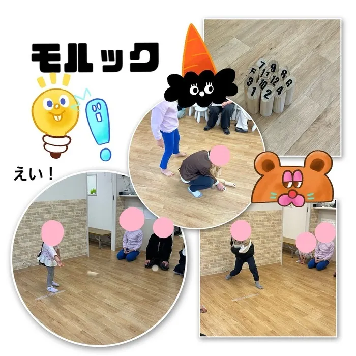 「負けても泣かない!」「転がしたほうがいいかな?」と子どもたちは熱く集中してモルックを楽しんでいました😆