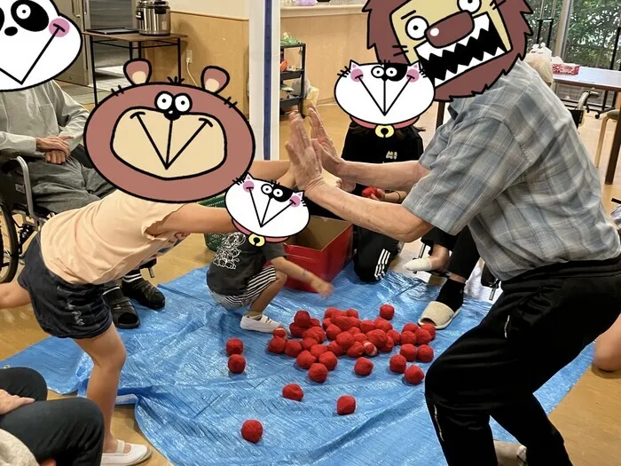 玉入れはおじいちゃん、おばあちゃんと子ども達で混合チームを作って対決しました