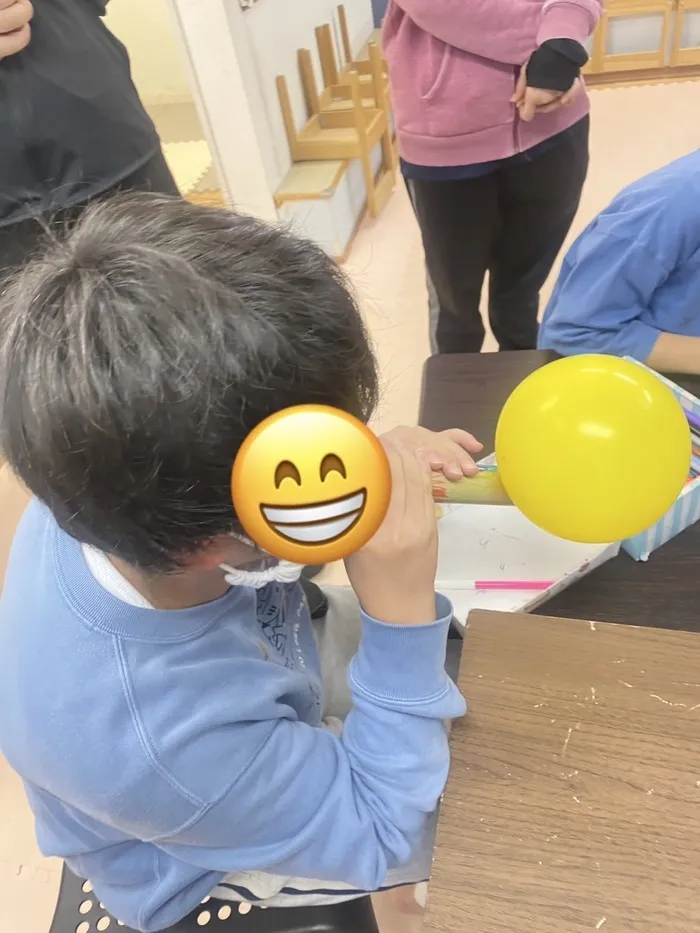 ラッパのように吹いて、風船が膨らんだ時に口を離すと「ボーン」と大きな音が鳴りました☺️