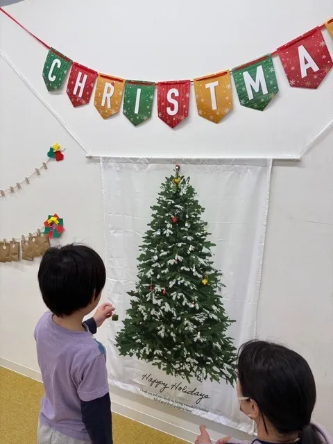 今回は子どもたちと一緒にオーナメントを飾る活動をしました。キラキラとした飾りを手に取りながら、どこに付けようかと楽しそうに考える姿が見られました。